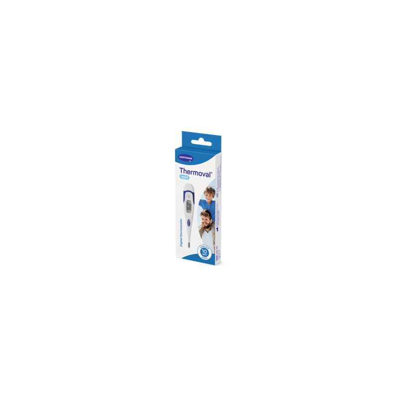 Das Digitalthermometer von HARTMANN Thermoval® rapid, zeichnet sich durch seine kurze Messzeit von ca. 10 Sekunden und die extragrosse Digitalanzeige aus. Das Thermometer bietet